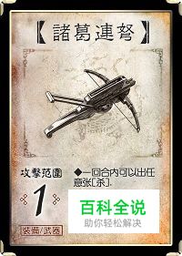 诸葛连弩 两张,梅花A和方块A 攻击范围1;特效:出牌阶段,你可以使用任意张杀。 当装备诸葛连弩后,即可以进行无限制出杀。在这里就隐藏着一个小技巧,当拥有诸葛连弩时,不需立即装备。可先装备其他武器使用杀来发动武器特效,然后再换上诸葛连弩来发挥连杀的效果。比如,当有目标因装备了+1马而无法使用连弩时,便可先装备麒麟弓将+1马射去,再使用诸葛连弩。