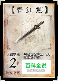 青釭剑 一张,黑桃2 攻击范围2;特效:锁定技,每当你使用杀攻击一名角色时,无视该角色的防具。 青釭剑是一切防具的克星,装备青釭剑对装有防具的目标使用杀时,由于出牌者的声明中包含了锁定发动的青釭剑特效,所以在判断杀的目标时,会自动将该目标的防具忽略,从而跳过目标防具发动特效的流程,进入到杀的结算过程中。 可能有人会问仁王盾的特效也是锁定技,为何也无法发动?在面杀中,由于缺少了第三方(裁判)的介入,所以在事件流程上是缺失的。OL版可以很好的解释这个问题,当装备青釭剑的客户端向服务器发出杀的声明后,服务器接收到来自客户端的信息,并根据声明中的特效以及目标内容去判断该目标后续将进行的行动。此时,不会存在装备仁王盾的客户端向服务器发来发动特效的信息。所以服务器在经过判断后会直接进入到杀结算的流程,询问该目标是否使用闪。 同理,其他锁定技的防具也是如此。这里也存在着一个小小的技巧,当装备青釭剑对装备藤甲的目标使用火杀时,如果目标不闪,则只会对该目标造成1点伤害。