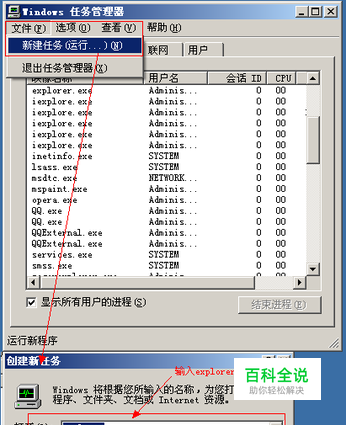 如果没有explorer.exe进程的话,点击Windows 任务管理器的左上角“文件”,在文件的下拉菜单中,单击“新建任务(运行),输入explorer即可打开桌面。