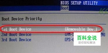 启动优先级设备选择(Boot Device Priority)在第一启动设备(1st Boot Device)里选择U盘。如果没有发现您的U盘,按键盘上的回车键进入下一步。如图