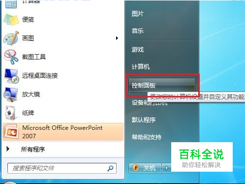 点击屏幕左下角的Windows开始按钮在出现的菜单中单击选择“控制面板”。