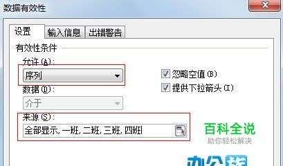 点击单元格G1,选择菜单栏--数据--有效性--设置,然后再允许中选择序列,下方的来源输入全部显示,一班,二班,三班,四班。