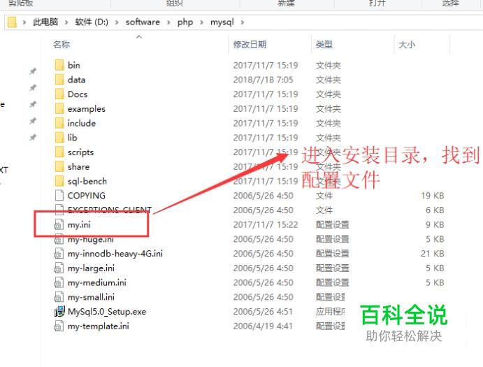首先我们进入mysql的安装目录,如下图所示,打开my.ini文件