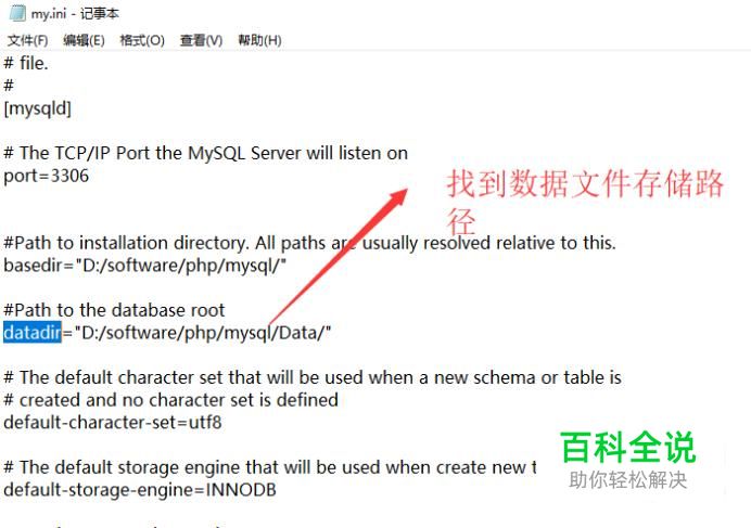 接下来在打开的my.ini文件中,我们找到datadir所在行,如下图所示,复制此行的路径