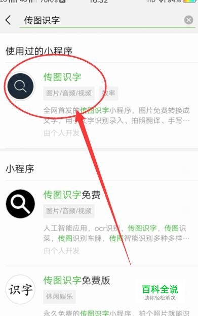 打开手机微信,进入小程序页面,搜索“传图识字”,如图所示。