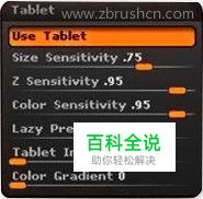 数位板在ZBrush中的调节使用 通常情况下,我们只需要正确安装了数位板的驱动程序就可以直接在ZBrush中使用了,ZBrush对各种品牌的数位板支持都不错,默认设置下就可以识别并且使用压感笔雕刻。 但是对于一些经常使用个性设定的朋友,默认的设置肯定是不够的,我们也可以通过调节Preference菜单下的Tablet子面板来定制自己的数位板设置,如图所示。