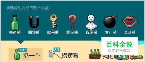 1、普通瓶 瓶子在海上漂浮,或许会有人捡起并回应您。 2、同城瓶 瓶子会漂向和您同一个城市的有缘人。 3、暗号瓶 留下您的暗号,可以是一个日期、一个地点、一部电影、一本书等等,瓶子会漂向写过同样暗号的人。 4.提问瓶 遇到不懂的问题?把它装进提问瓶,然后扔出去,可能会有人回复您的。 5.祝愿瓶 祝愿瓶可以是许愿、对自己或对他人的祝福。 6.发泄瓶 生活中难免会有不愉快,把它装进发泄瓶猛力一扔,就这样抛之脑后吧。发泄瓶不会漂向别人,但有可能被捞瓶子的人捞到。 7.真话瓶 您敢玩真心话大冒险吗?打开真话瓶,会随机出现一个问题,请诚实地回答。匿名的真话瓶,让您放心地倾诉真心话。