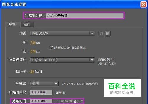 选择图像合成 — 新建合成组,在弹出的图像合成设置窗口中的合成组名称处输入工程文件的名字,持续的时间可以设置为15秒,当然,这个持续时间的长短由你来设置,随你喜欢!不过建议5到10秒合适,一般文字显示时间不需要太长。