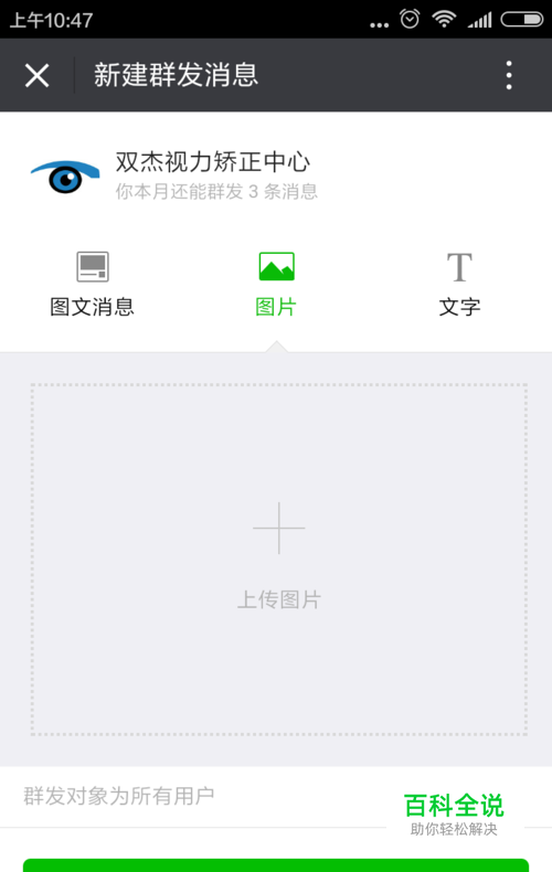 点击“群发”--“新建群发”可以发送图文消息或者图片还有文字,图文消息发 送的前提是你的素材库有编辑好的文章,群发图片或者文字消息直接上传编辑文 字就可以
