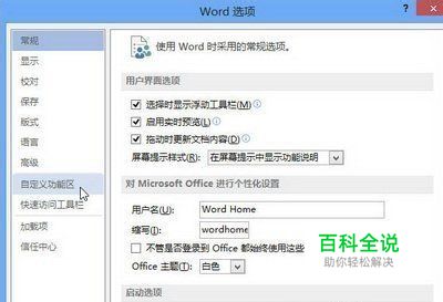在打开的“Word选项”对话框中,单击左侧的“自定义功能区”按钮,如下图所示。
