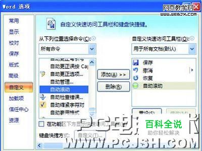 首先运行Word 2007程序,然后依次点选界面左上角的“Office按钮”-->“Word选项”。切换到“自定义”标签页,在左边窗口中选择“从此位置选择命令”下拉菜单中的“所有命令”,再将其中一个名为“自动滚动”的命令添加到右边窗口的“自定义快速访问工具栏”中(如图)。