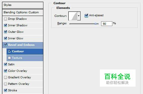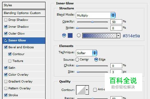 接下来的步骤主要就是运用photoshop的图层样式功能的。我们要分别设置:内阴影、外发光、内发光、斜面浮雕、等高线、光泽、颜色叠加、描边共8种图层样式。