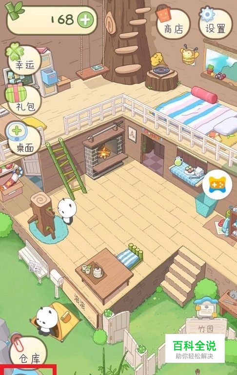 刚步入‘熊孩子’的画面中,熊猫在木桩前打坐,点按左下角的‘仓库’图样。