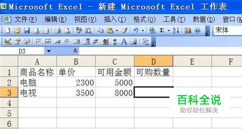 如下图中,我们已知电脑、电视的单价和可用金额,要求可购数量;