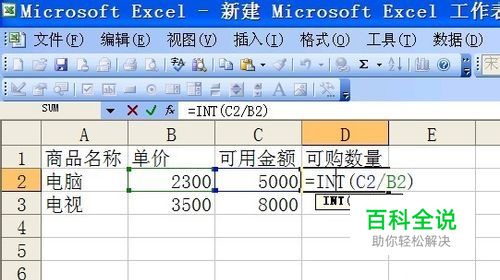我们只要在 D2单元格中输入公式=int(c2/b2),可以计算出可购买的数量;