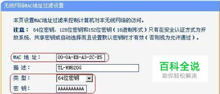 2、单独密钥的使用。在路由器管理界面中,依次打开“无线设置”->“MAC地址过滤”,在“MAC地址过滤”界面点击“添加新条目”,打开“无线网络MAC地址过滤设置”界面,依次填上下列配置:“MAC地址”参数填入无线网卡的MAC地址,类型”选择 “64位密钥”即可,密钥”填入了10位AAAAAAAAAA,“状态”选择生效,配置完成后点击“保存”按钮,如图: