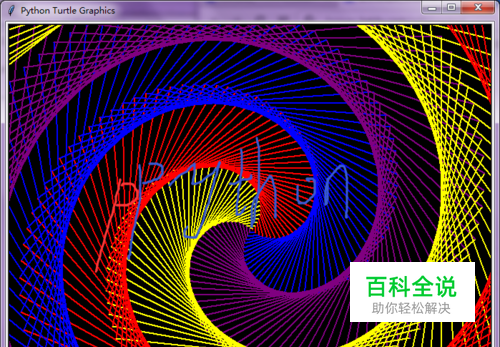 2.编写算法: 该算法用于实现画出彩色的螺旋线,具体如下,注意代码的缩进情况: import turtle import time turtle.pensize(2) turtle.bgcolor("black") colors = ["red", "yellow",'purple','blue'] turtle.tracer(False) for x in range(400): turtle.forward(2*x) turtle.color(colors[x % 4]) turtle.left(91) turtle.tracer(True)