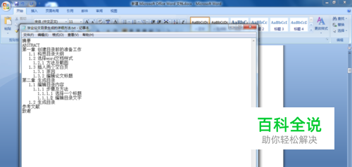 生成本文的目录实例: (1)“摘要”是一级目录,所以选择了“标题1”之后,在页面中光标处写入“摘要”,然后回车; (2)“ABSTRACT”是一级目录,同上;回车; (3)添加二级目录,在创建“第一章生成目录前的准备工作”目录后,回车,然后选择“标题2”,在光标处填写“1.1构思目录大纲”,回车; (4)添加三级目录,方法同上,只不过选择的是“标题3” (5)创建四级目录,方法同上,只是选择“标题4” (6)目录内容编辑完毕