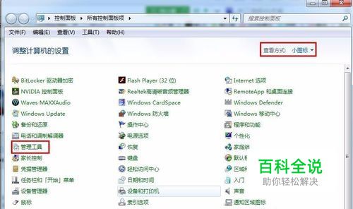 更改控制面板查看方式为“小图标”,找到并点击“管理工具”。