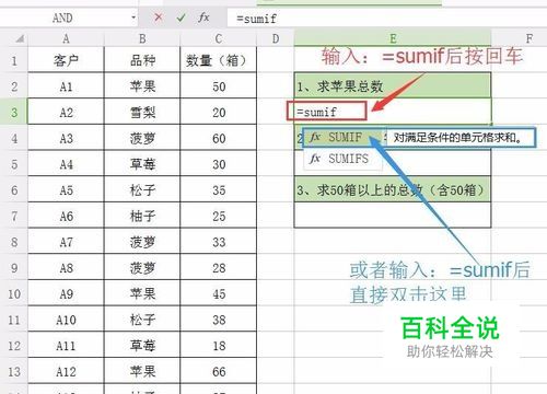 例子中第一个条件是: 1、求苹果总数 在单元格中输入: =sumif后按 回车,或直接在下面的选择中双击选择。 =SUMIF()