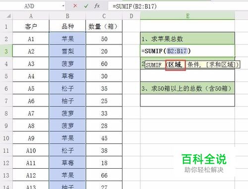 求和区域:指即将要求和的数据区域。 输入或者直接选择数据区域后回车,公式就完成了。 =SUMIF(B2:B17,"苹果",C2:C17)