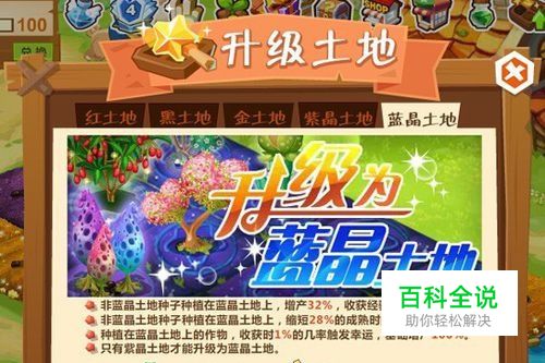 点击QQ农场主页的土地升级按钮,可看到在紫晶土地的后面新增了蓝晶土地的选项,点开后可看到升级的条件,除了需要大额的点券外,还增加了三种营养液的数量要求。下面给朋友们简单介绍一下点券和营养液的获得方法。
