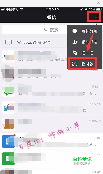 打开手机微信,点击右上角的“+”,在下拉小菜单中选择“收付款”。