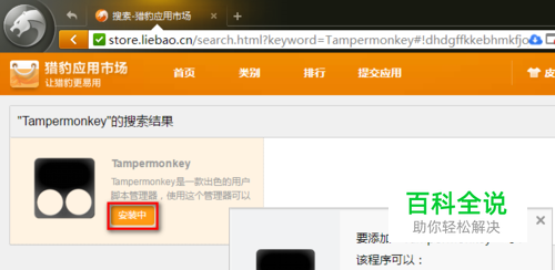 1.打开猎豹应用市场,搜索并安装“Tampermonkey”。