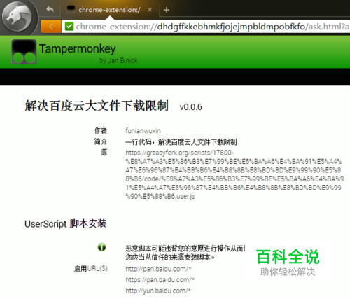 2.打开如下链接安装“解决百度云大文件下载限制”插件。 https://greasyfork.org/en/scripts/17800-%E8%A7%A3%E5%86%B3%E7%99%BE%E5%BA%A6%E4%BA%91%E5%A4%A7%E6%96%87%E4%BB%B6%E4%B8%8B%E8%BD%BD%E9%99%90%E5%88%B6 https://greasyfork.org/scripts/17800-%E8%A7%A3%E5%86%B3%E7%99%BE%E5%BA%A6%E4%BA%91%E5%A4%A7%E6%96%87%E4%BB%B6%E4%B8%8B%E8%BD%BD%E9%99%90%E5%88%B6/code/%E8%A7%A3%E5%86%B3%E7%99%BE%E5%BA%A6%E4%BA%91%E5%A4%A7%E6%96%87%E4%BB%B6%E4%B8%8B%E8%BD%BD%E9%99%90%E5%88%B6.user.js