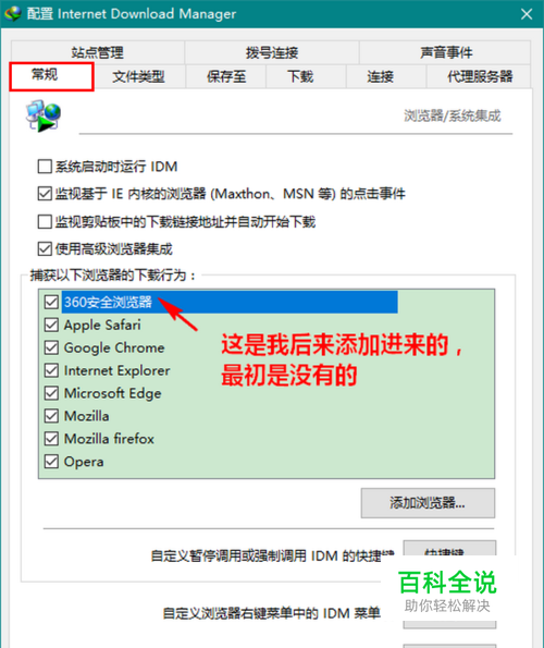 打开选项窗口后,先切换到“常规”选项卡,这时便可以在下方的列表框中看到所支持的浏览器。注意,如果你的浏览器没有在这里面,则需要自己将它添加进来。