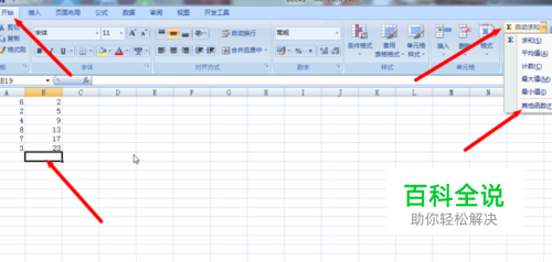 在Excel中有很多的函数,我就用求相关系数来为大家讲一下在Excel中函数的输入。首先,打开Excel,选定你想要求得结果的单元格,单击“开始”选项卡,然后在“编辑”菜单栏中选择“自动求和按钮”,然后单击“其他函数”,如图所示。