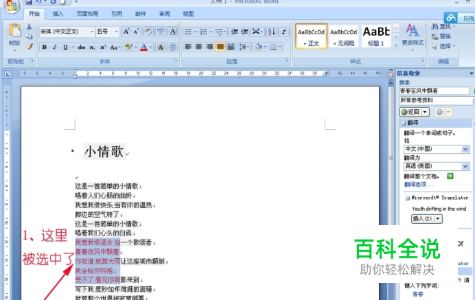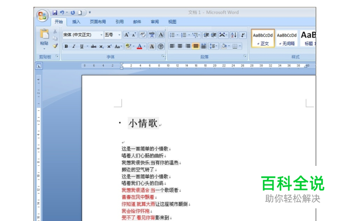 我们打开word2007,在里面输入《小情歌》的歌词。我们想把其中红色字体的部分选中并复制。如果运用传统的复制粘贴方法是不好选的。