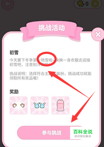 点击本关图标,进入文字提示部分,该部分强调雪。所以就要穿厚点,注意保暖。点击下方的参与挑战,进入本关