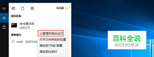 在开始菜单栏中输入cmd,右键以管理员身份运行