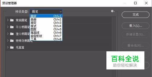 2.点击“预设管理器”,打开管理器界面,有“画笔”、“色板”、“渐变”、“样式”、“图案”、“等高线”、“自定义”等等预设。