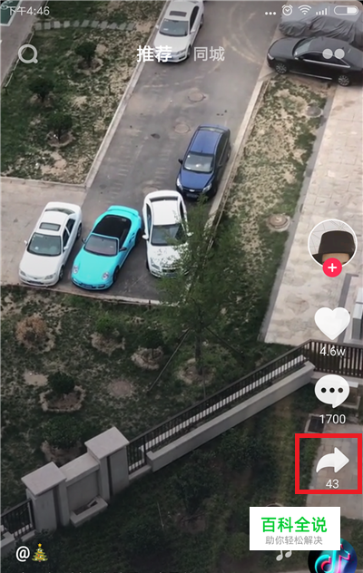 进入抖音后找到自己喜欢的抖音视频,在视频的右边找到【转发】按钮并点击。