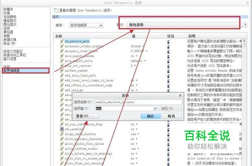 1、首先激活Creo 2.0 的绝对精度选项,系统默认是不显示绝对精度选项的,必须激活绝对精度选项才可以精心设置。 方法:【文件】—》【选项】—》【配置编辑器】—》【所有选项】—》【添加】/【查找】,把选项: enable_absolute_accuracy 的值更改为 Yes 即完成设置。