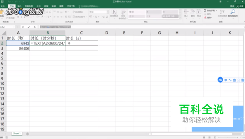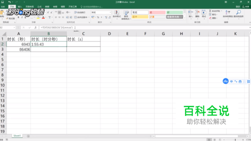选中C2单元格,输入公式“=TEXT(B2,"[s]")”。