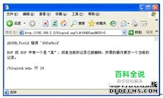 .“1=1和1=2”法 “加引号”法很直接,也很简单,但是对SQL注入有一定了解的程序员在编写程序时,都会将单引号过滤掉。如果再使用单引号测试,就无法检测到注入点了。这时,就可以使用经典的“1=1和1=2”法进行检测。 如果正常页面链接地址为:http://www.xxx.com/xxx.asp?id=YY,在浏览器中分别输入以下两个链接地址,分别查看它们返回的结果值。 Ø http://www.xxx.com/xxx.asp?id=YY and 1=1。 Ø http://www.xxx.com/xxx.asp?id=YY and 1=2。 如果存在注入点的话,浏览器将会分别显示为: Ø 正常显示,内容与正常页面显示的结果基本相同。 Ø 提示BOF或EOF(程序没做任何判断时),或提示找不到记录,或显示内容为空(程序加了on error resume next),如图1.4所示。 如果没有注入点的存在,也很容易判断。 上述两种链接一般都会有程序定义的错误提示,或提示类型转换时出错。