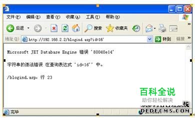 .“加引号”法 在浏览器地址栏中的页面链接地址后面增加一个单引号,如下所示: http://www.xxx.com/xxx.asp?id=YY’ 然后访问该链接地址,浏览器可能会返回类似于下面的错误提示信息: Microsoft JET Database Engine 错误’80040e14’ 字符串的语法错误在查询表达式’ID=YY’中。 /xxx.asp 行8 如图1.3所示,页面中如果返回了类似的错误信息,说明该网站可能存在SQL注入攻击的漏洞。