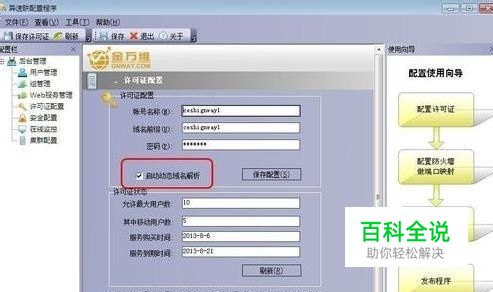 登陆金万维服务器端,进入配置界面,点击配件许可证,然后点击“点击申请试用账号”。
