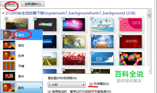 选择全选,图片位置(P)中选填充(最好),让它铺满桌面,当然大家也可以选择其他的,然后选择是否有序和更改时间设置。最后记得点击保存修改就OK了。