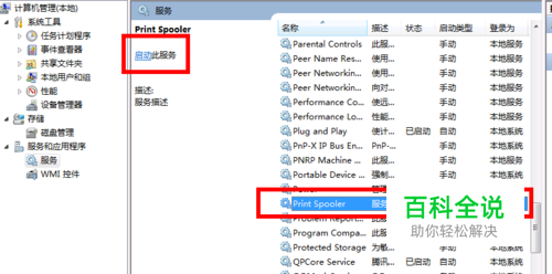 找到PrintSpooler服务.单击会出现启动(或者重启动)的界面。如果已经开启了。重启即可。