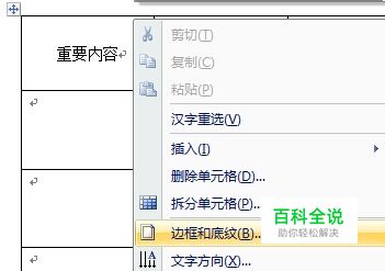 选定“重要内容”的那一格,点击右键下拉菜单,点击其中的“边框和底纹”,进入选项页面