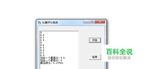 如何使用评分系统呢?双击比赛评分系统.exe文件,就打开一个窗体,单击开始,输入第一个裁判评分,确定。直到输入第十个裁判评分后,系统就会显示该选手最后得分。然后单击关闭,结束运行。