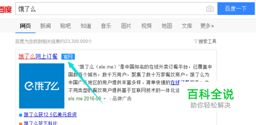 首先我们打开浏览器,然后在搜索引擎中输入饿了么,点击如图所示的搜索结果: