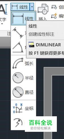 选择标注尺寸工具 线性:用以标注水平垂直尺寸 对齐:标注斜面尺寸 角度:需要提供两条线标注角度尺寸 半径直径:提供圆面