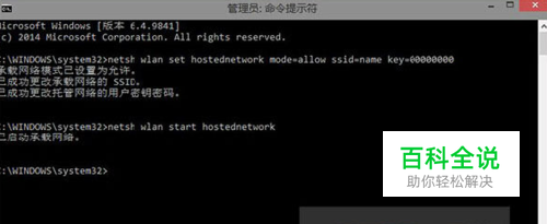回车键后,会提示“已启动承载网络”,虚拟无线热点就创建完成并且成功启动,就可以连接使用了。