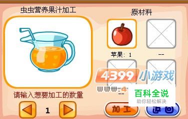 一 虫虫营养果汁: 所需材料:1个苹果 在三兄弟小屋里每天可以得到一个苹果种子、在小屋种下、一般来说如果你勤快的话可以得到3到5个苹果、再到梅森小屋里去找R4合成