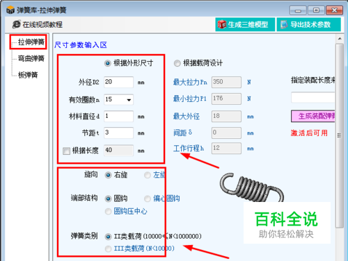 打开面板后,选择弹簧类型进行设计,有两种尺寸参数,一种是根据弹簧外形尺寸来设计弹簧,另外一种是根据弹簧承受的载荷来设计弹簧,根据自己需要选择,如图所示